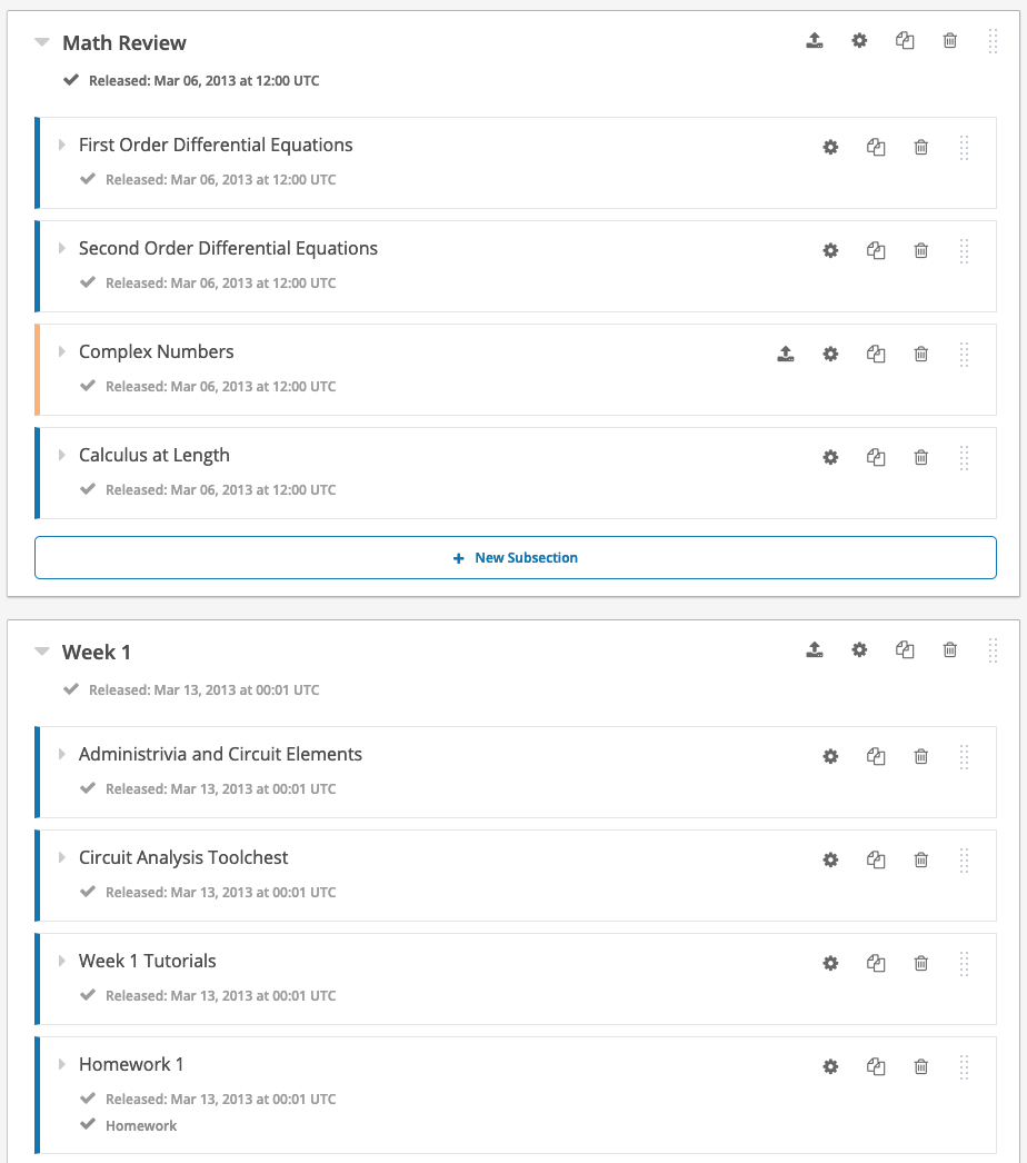 The backbone of your course is how it is organized. Studio offers an Outline editor, providing a simple hierarchy and easy drag and drop to help you and your students stay organized.